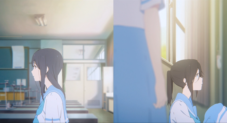 저번 야마다 나오코 특집 글을 쓸 시점에는 알아채지 못한 것인데, 야마다 나오코는 목소리의 형태 시절부터 대비 연출을 자유자재로 구사하기 시작했다. 목소리의 형태 글에도 써놨으니 보고 오시는 것도 좋겠다. 리즈와 파랑새에서 미조레와 노조미가 처음으로 나오는 장면은 두 사람의 등교 장면이다. 두 사람의 등교를 보면 미조레가 먼저 와서 계단에 앉아 노조미를 기다리고 있다. 그 후에 시작되는 두 사람의 등교는 그야말로 비정상적 그 자체다.
