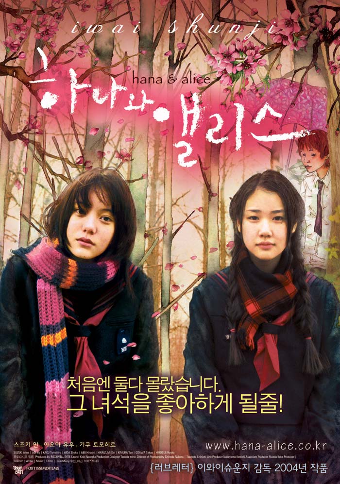 내가 이와이 슌지 감독의 작품을 접한 것은 2015년 공개된 로토스코핑(실사 촬영 후에 프레임을 전부 따라 그려 만드는 기법) 애니메이션 영화 <하나와 앨리스: 살인사건>이었다. 이 작품은 오늘 리뷰할 영화 <하나와 앨리스> 연작의 두 번째 작품이자 프리퀄이기도 하다. 하지만 나는 두 작품을 바로 연달아 보지 않았다. <하나와 앨리스: 살인사건>의 소녀 감성으로 이루어진 아름다운 추억의 분위기를 깨고 싶지 않았기 때문이기도 하고, 이런 감상을 이어서 느낄 수 있을까 하는 의문이 들었기 때문이기도 하다. 그러나 1년이 흐른 어느 날, 그저 심심해 <하나와 앨리스>를 감상하게 된 나는 그 생각을 후회하고 말았다. 영화 <하나와 앨리스>는 사랑이라는 이름으로 찾아온 두 소녀의 추억과 우정을 영원히 기억하고 싶게 만드는 아름다운 작품이다.